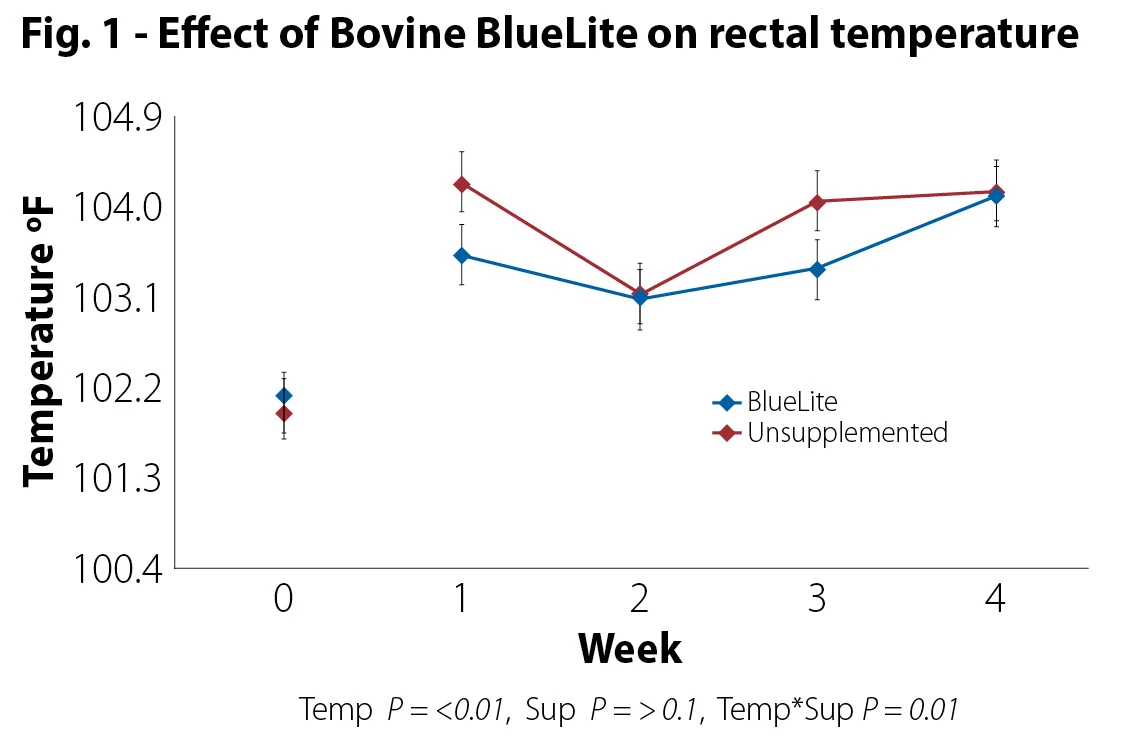 The Bovine BlueLite supplemented group showed a clear advantage over the unsupplemented group in lowering rectal temperature over the trial period. BlueLite supplementation also showed DMI and ECM advantages over the unsupplemented group. Additionally, the combination of abatement with Bovine BlueLite further enhanced the positive effects on DMI and ECM.