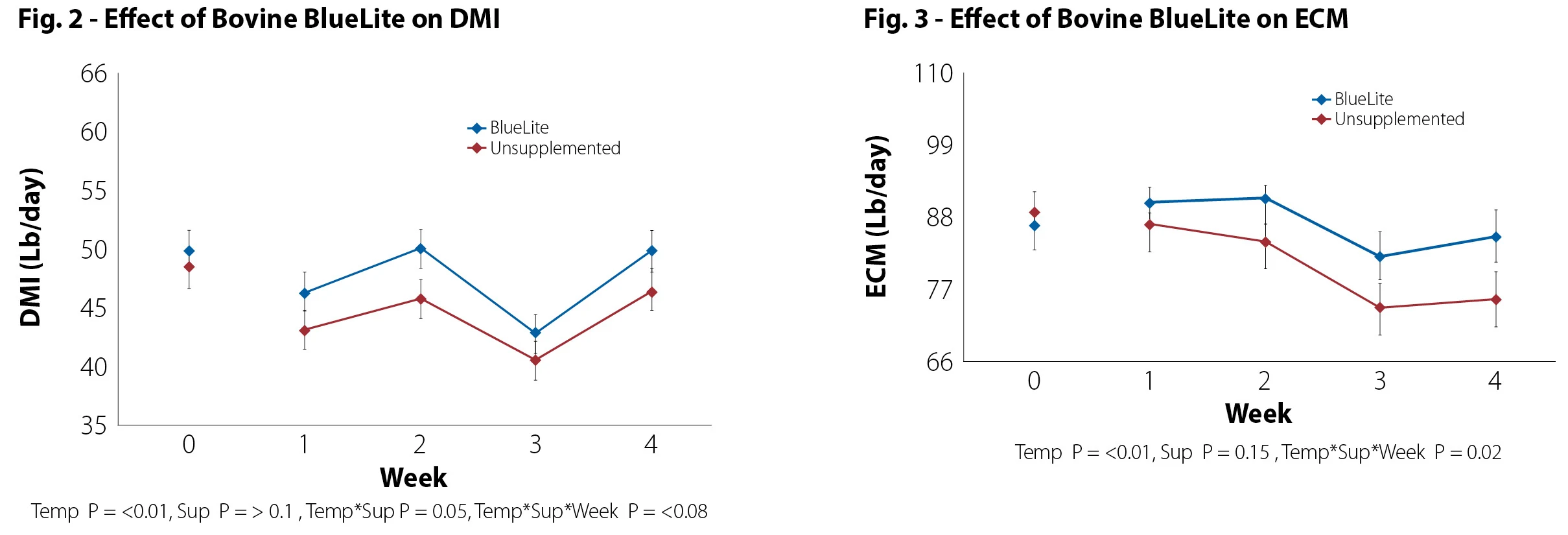 Results from a 4-week University of Florida research study demonstrated reduced body temperature, improved dry matter intake (DMI), and energy corrected milk (ECM) responses in heat stressed cows in a commercial setting. 52 cows were enrolled in the study and allocated to four groups (13 cows per group). 26 were housed with heatabatement equipment (fans or soakers), the other 26 had access to shade only. Within each housing condition, cows were further divided into two treatments: supplementation with Bovine BlueLite in the TMR or no supplementation (Control). Results reported below focus on the groups provided shade only.