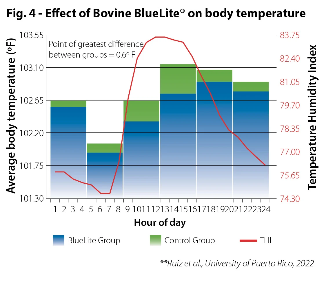 Research conducted at the University of Puerto Rico demonstrated reduced body temperature and improved milk yield responses in heat stressed cows in a commercial setting. Not only did the Bovine BlueLite supplemented cows have an increase in milk production (2.3 lbs./d) they also had a reduced body temperature (0.6ºF, P<0.01) when the THI was the highest (Fig. 4).