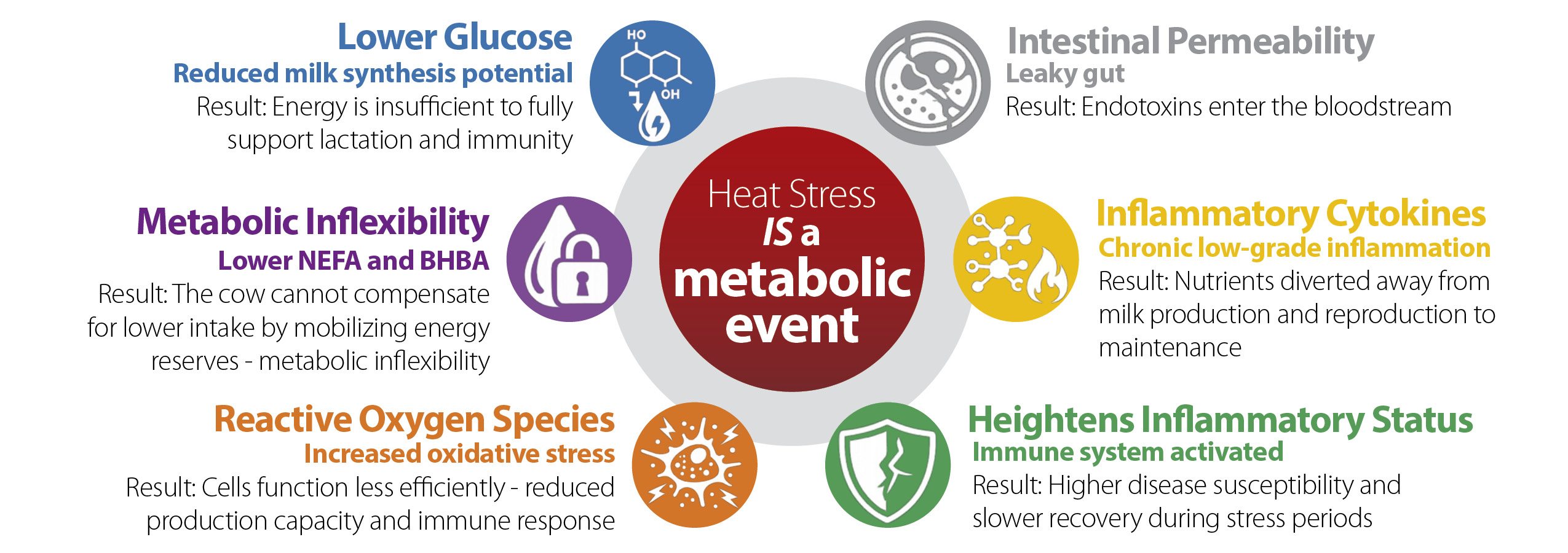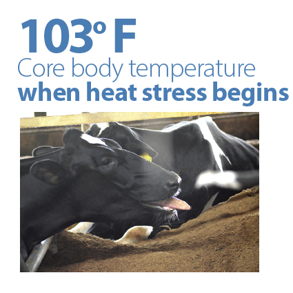 Research shows that internal body temperature is the driving factor in negative physiological responses during heat stress events. Ambient Temperature Humidity Index (THI) provides an indication of conditions when heat stress can occur (THI > 72), but an elevated body temperature is what initiates metabolic dysfunction— driving health and performance down. A dairy cow’s high metabolic rate and large size challenges their efficiency at dissipating heat on their own (Zhu et al., 2020). The result can be a cascade of negative metabolic and performance outcomes.
