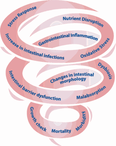 The stress response is probably the triggering factor of a sequence of events that impair gut health after weaning, this can be visualized as a spiral of alterations or changes similar to a tornado with severe effects that can evolve to disease and mortality.